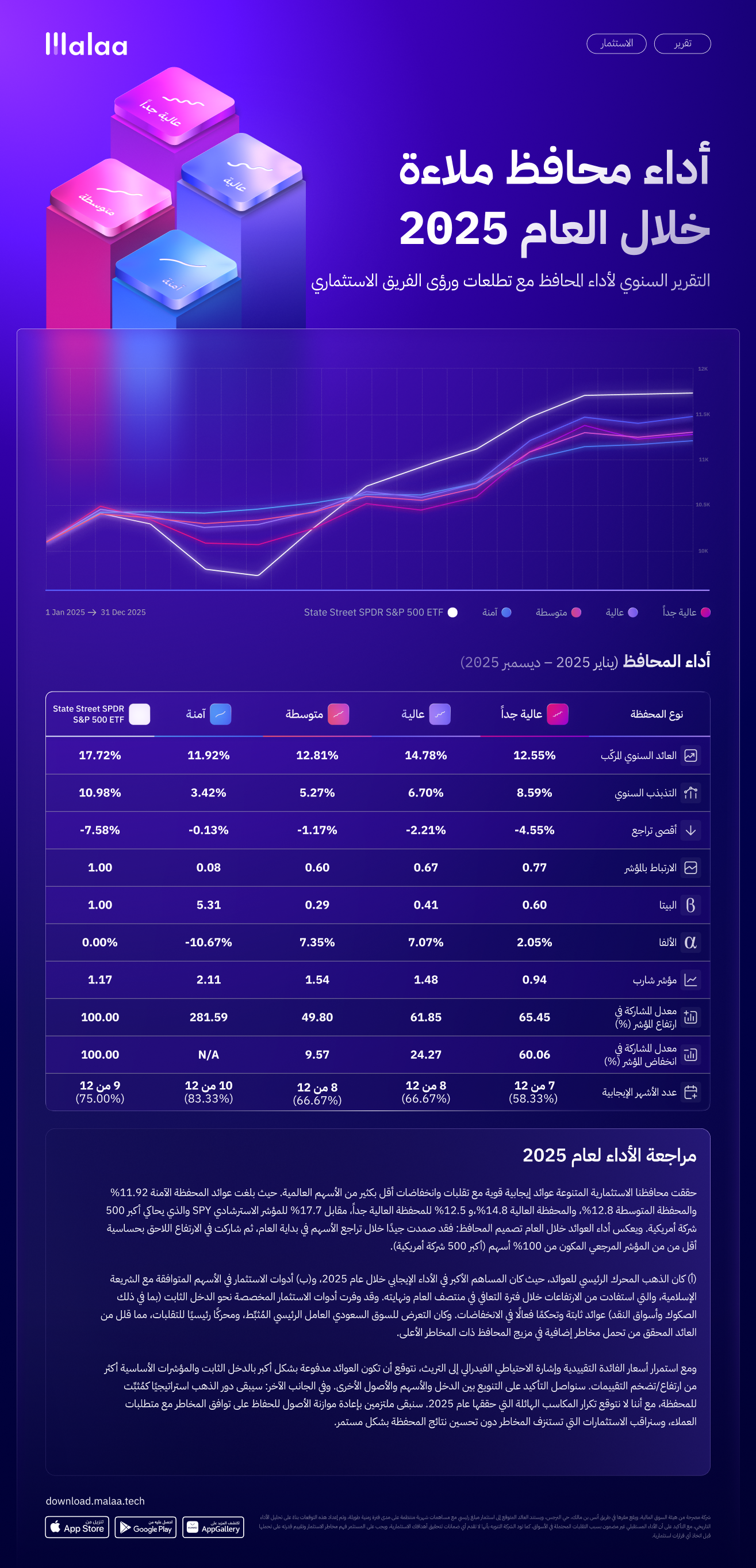(أ) كان الذهب المحرك الرئيسي للعوائد، حيث كان المساهم الأكبر في الأداء الإيجابي خلال عام 2025، و(ب) أدوات الاستثمار في الأسهم المتوافقة مع الشريعة الإسلامية، والتي استفادت من الارتفاعات خلال فترة التعافي في منتصف العام ونهايته. وقد وفرت أدوات الاستثمار المخصصة نحو الدخل الثابت (بما في ذلك الصكوك وأسواق النقد) عوائد ثابتة وتحكمًا فعالًا في الانخفاضات. وكان التعرض للسوق السعودي العامل الرئيسي المُثبِّط، ومحركًا رئيسيًا للتقلبات، مما قلل من العائد المحقق من تحمل مخاطر إضافية في مزيج المحافظ ذات المخاطر الأعلى.